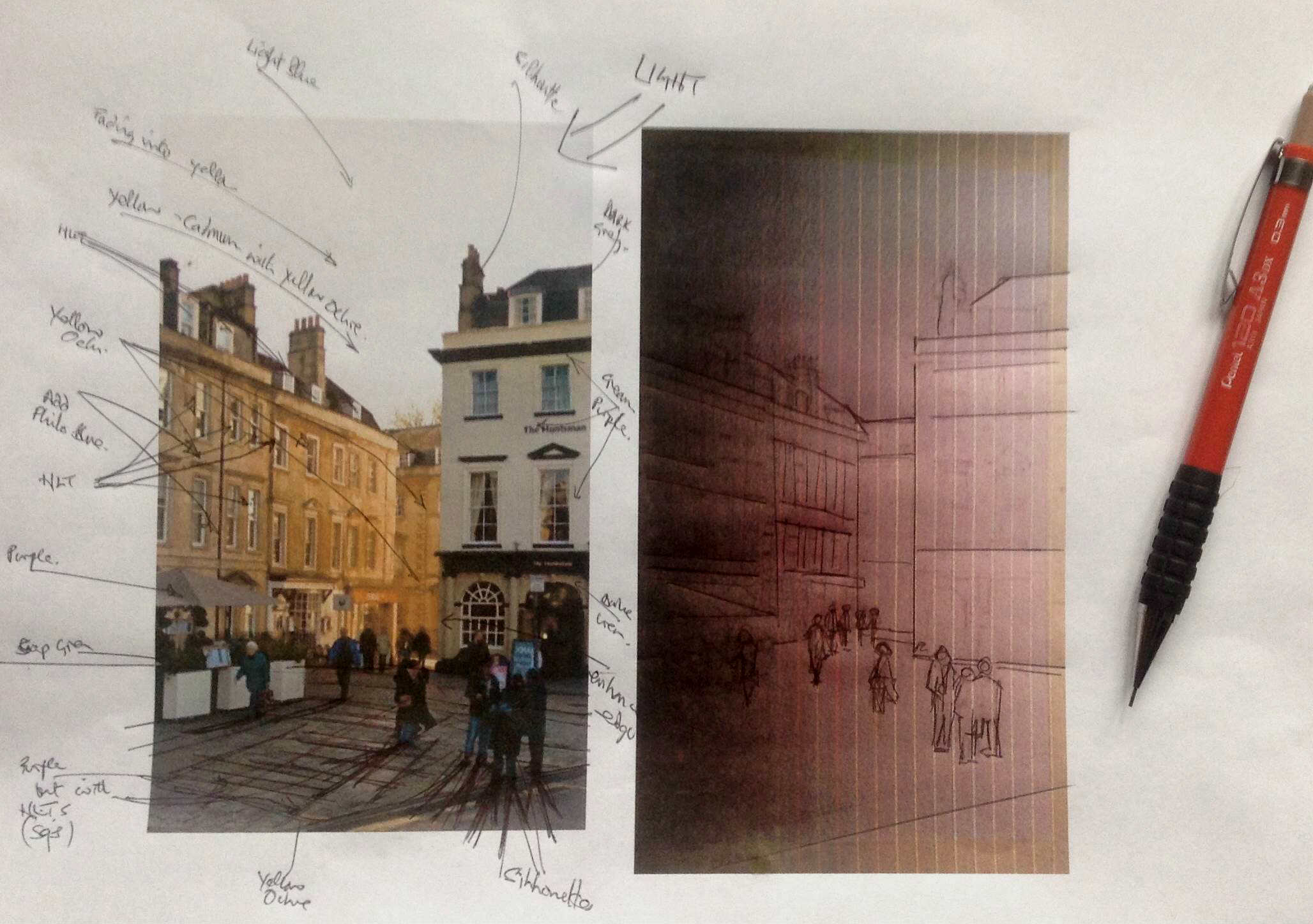 This was also very valuable in identifying angles and dimensions. There was a lot of pavement and this would be broken up by people and perspective lines but from a balance point of view this worried me. I moved to the next stage by drawing the scene on to watercolour paper. To check angles and dimensions I printed out the line drawing against the original photo.