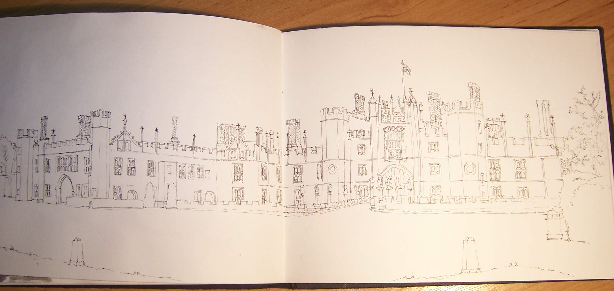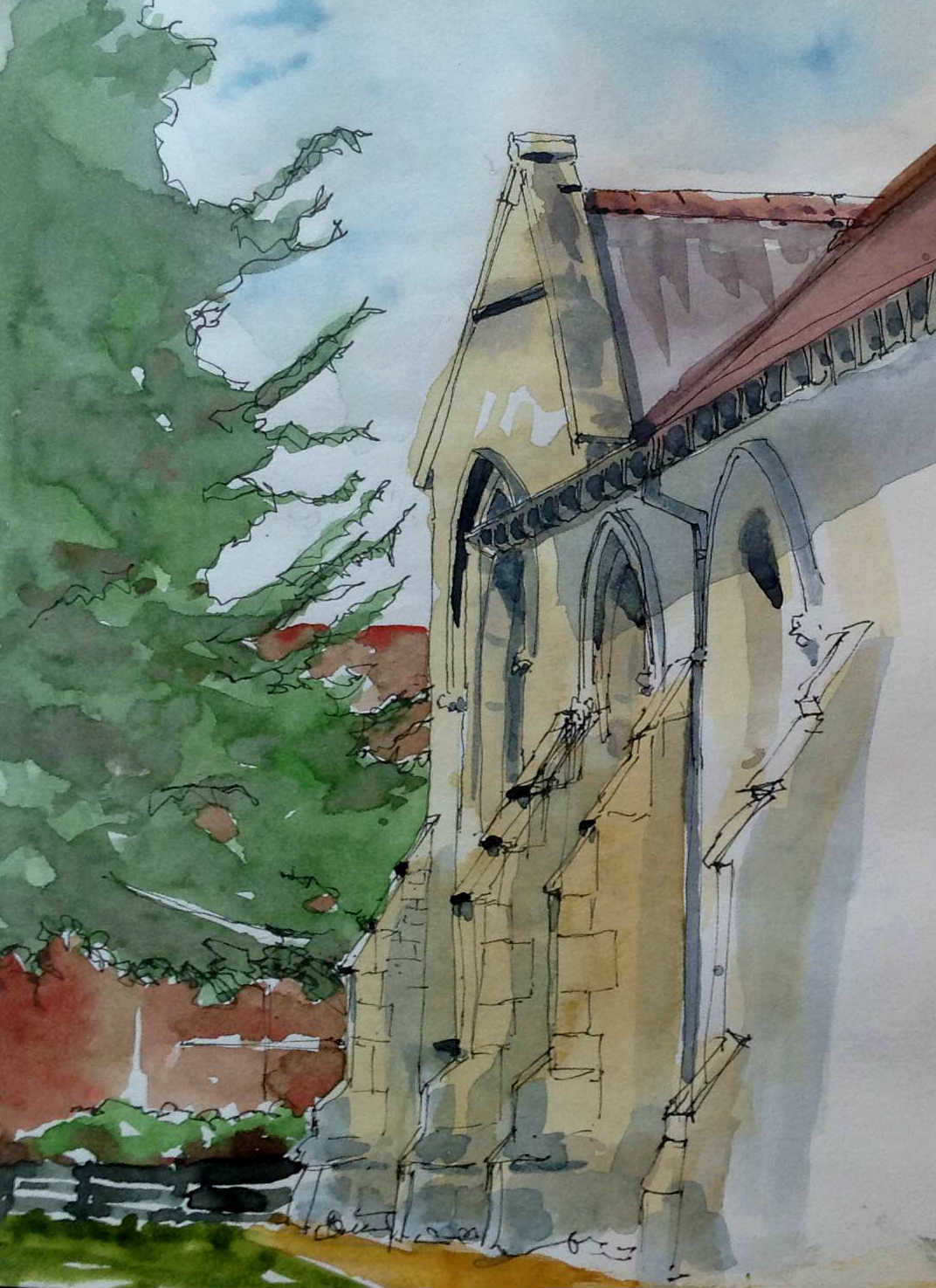 Two of the most obvious are marked on the photo. I felt the portrait version (red) was worth taking forward. It had interesting light and not so many windows. So I made a sketch of the scene to understand the composition more, identifying tone, depth and detail.