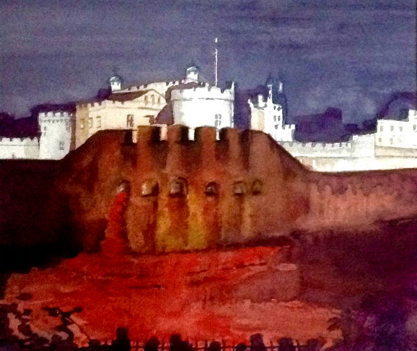 A request for a painting by a work colleague has resulted in a strange painting. She sent me some atmospheric photos of the tower and the poppies at night. I’ve never painted night time before and these very emotive pictures were always going to be a challenge. I didn’t want to lose the strong contrasts and the distance on the battlements and felt there wouldn’t be too much detail required – I as wrong. However, it was a study mainly of colours and contrast and this meant more time painting than normal.