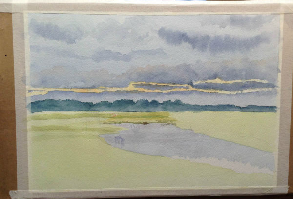The first painting must be the oranges and yellows of the sunset. I can then place the base washes upto and around this strip of colour.