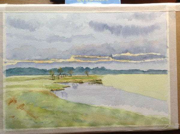 Well, the drawing didn’t take long. The trees will be added later so I needed to get the sky and some of the ground and water painted in. look hard and you will see some line work.