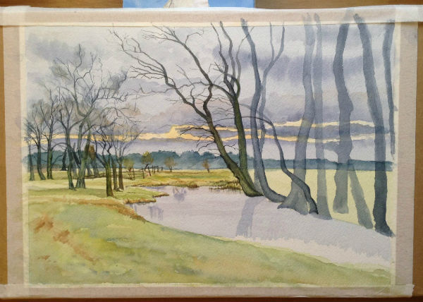 Hanging on a quiet wall at my Mothers house is a rather dour Victorian watercolour of a river and winter trees. It’s largely been overlooked but I was peering at it the other day when I realised the skill in the painting is outstanding. I’ve borrowed it for a short while in order to make a study of it.