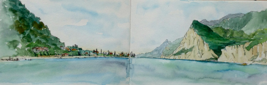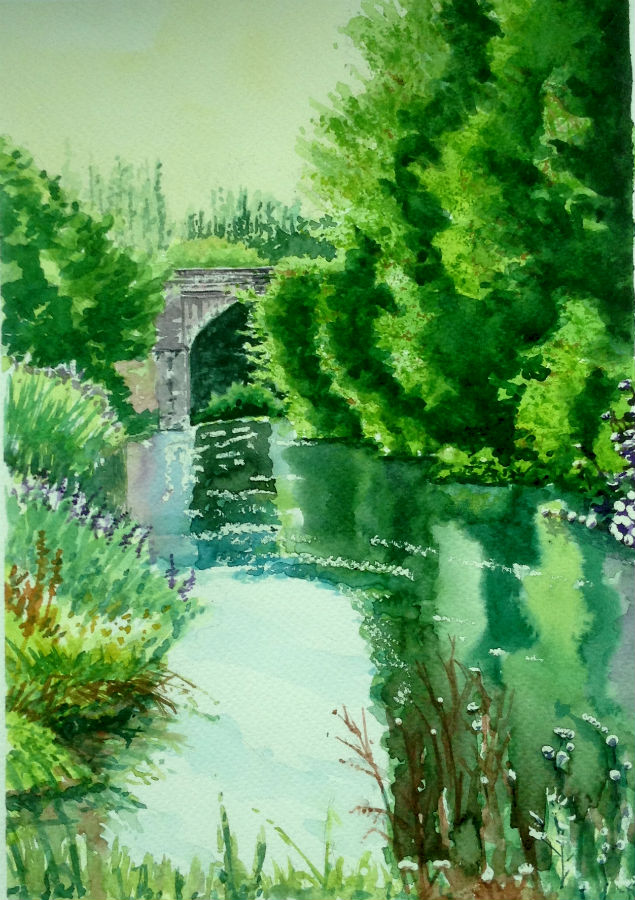 The final painting of Leatherhead, for now, is of the River Mole as it passes under the railway bridges and on to the water meadows downstream. I was looking for a scene that captured the water reflections, the shadows under the bridge and the curve of the river. I’m not that happy with this painting as the trees are too uniform in colour and the sky too yellowish. But its worth showing as a comparison to other work on this blog.